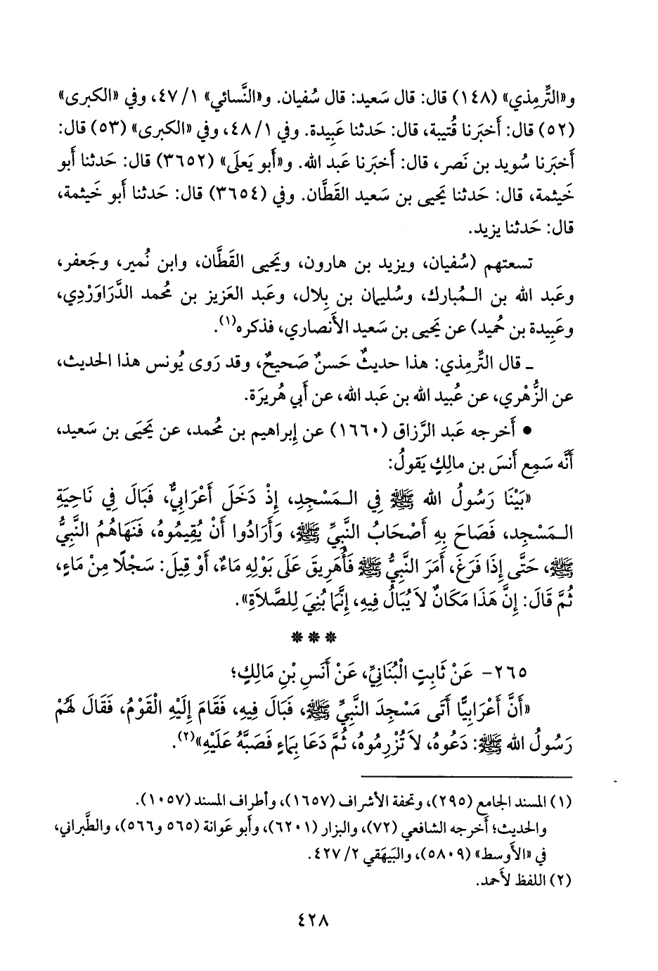 «بينا رسول الله صَلى الله عَليه وسَلم في المسجد، إذ دخل أعرابي، فبال في ناحية المسجد، فصاح به أصحاب النبي صَلى الله عَليه وسَلم وأرادوا أن يقيموه، فنهاهم النبي صَلى الله عَليه وسَلم حتى إذا فرغ، أمر النبي صَلى الله عَليه وسَلم فأهريق على بوله ماء، أو قيل: سجلا من ماء، ثم قال: إن هذا مكان لا يبال فيه، إنما بني للصلاة».