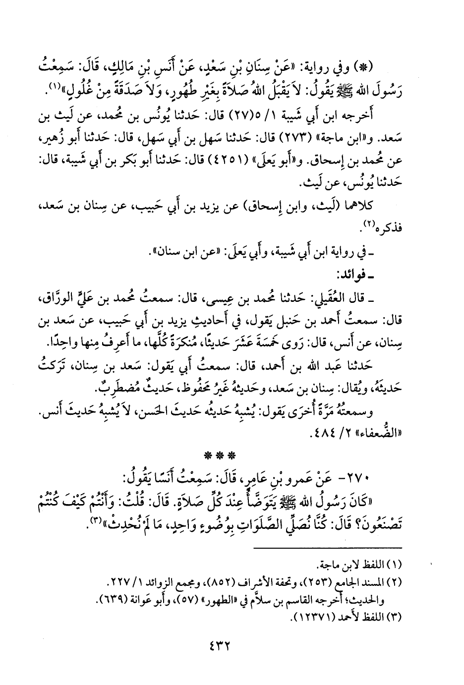 - قلنا: إِسناده ضعيفٌ؛ قال محمد بن علي الورَّاق: سمعتُ أَحمد بن حنبل يقول، في أَحاديث يزيد بن أَبي حبيب، عن سعد بن سِنان، عن أَنس، قال: روى خمسةَ عَشَر حَديثًا، مُنكرة كُلها، ما أَعرفُ منها واحدًا.