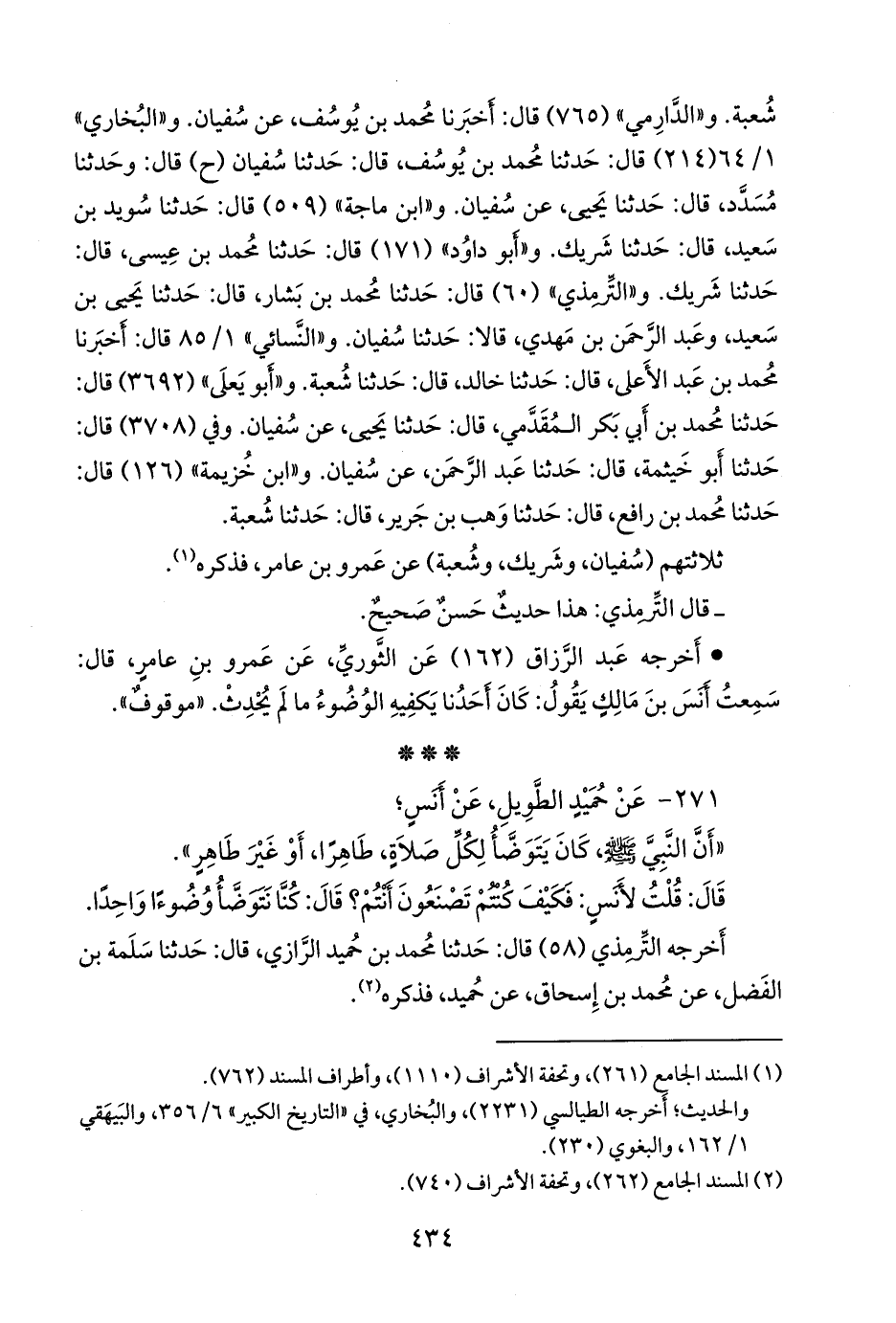 - قال التِّرمِذي: حديث أَنس حديثٌ حسنٌ غريبٌ، والمشهور عند أهل الحديث حديث عَمرو بن عامر، عن أَنس.
