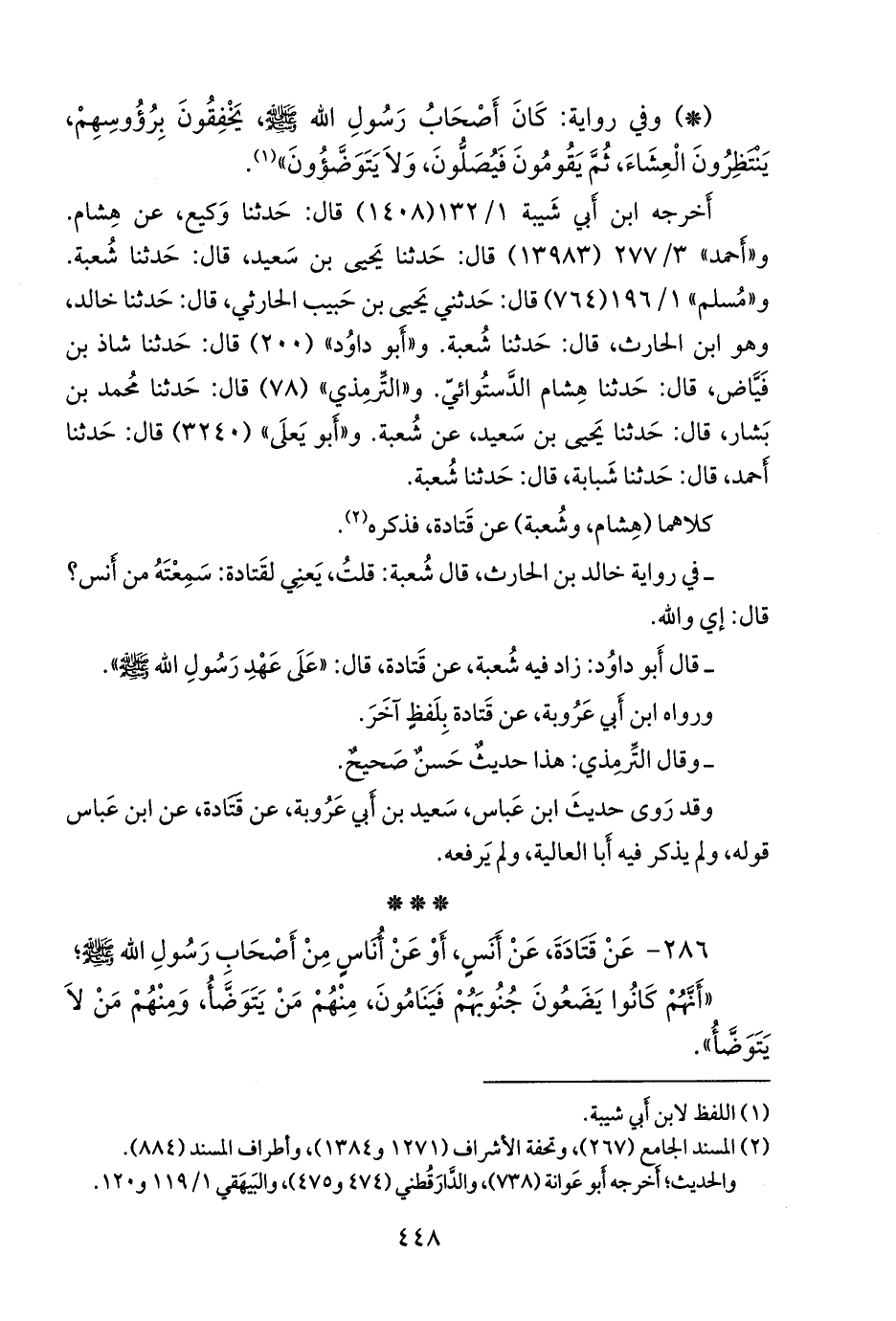 - هذا الحديث لا يدل على أَن هذا كان في عهد النبي صَلى الله عَليه وسَلم ولذا فله حكم الوقف، والموقوف لا تقومُ به حُجةٌ، ولا يثبتُ به حُكمٌ، ولولا قول أَبي داود: زاد فيه شعبة، عن قتادة، قال: «كُنا على عهد رسول الله صَلى الله عَليه وسَلم» لأَوردناه في أَبواب الموقوفات، وقد أَخرجه هنا أَحمد، ومسلم، والتِّرمِذي، وأَبو يَعلى، من طريق شعبة، ليست فيه هذه الزيادة، أَما طريق البيهقي المتصل الذي وردت فيه، فهو من رواية محمد بن بشار بُندار، عن يحيى بن سعيد القطان.