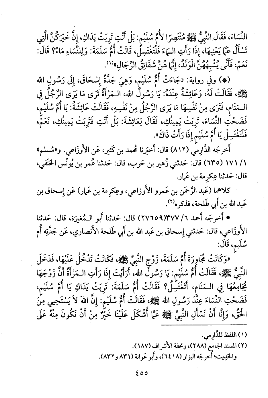 «قالت أُم سُليم: يا رسول الله، صلى الله عليك، المرأة ترى ما يرى الرجل في المنام؟ فقالت عائشة: فضحت النساء، فقالت: إن الله لا يستحيي من الحق، فقال النبي صَلى الله عَليه وسَلم: تربت يداك، فمن أين يكون الأشباه».