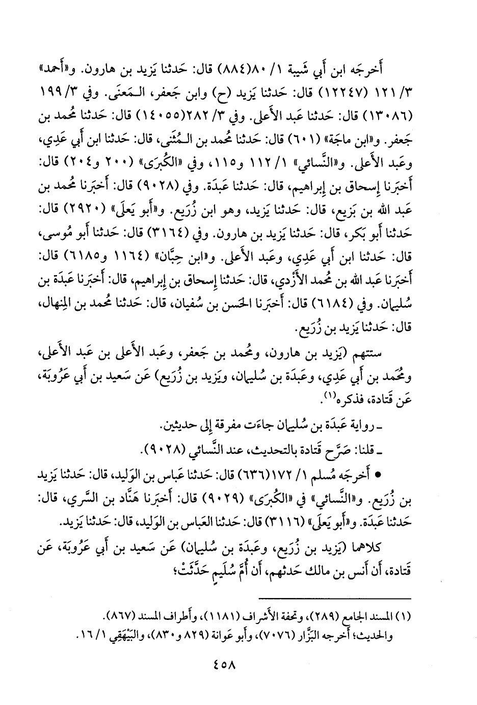 و «ابن حِبَّان» (١١٦٤ و ٦١٨٥) قال: أخبرنا عبد الله بن محمد الأزدي، قال: حدثنا إسحاق بن إبراهيم، قال: أخبرنا عَبدة بن سليمان. وفي (٦١٨٤) قال: أخبرنا الحسن بن سفيان، قال: حدثنا محمد بن المنهال، قال: حدثنا يزيد بن زُريع.