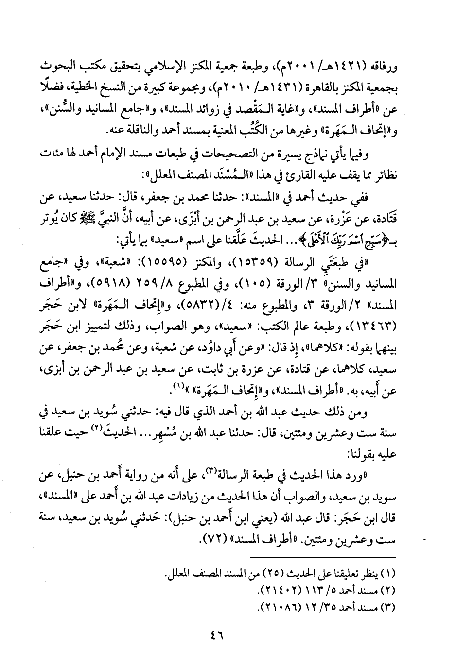 وفيما يأتي نماذج يسيرة من التصحيحات في طبعات مسند الإمام أحمد لها مئات نظائر مما يقف عليه القارئ في هذا "المُسْنَد المصنف المعلل":