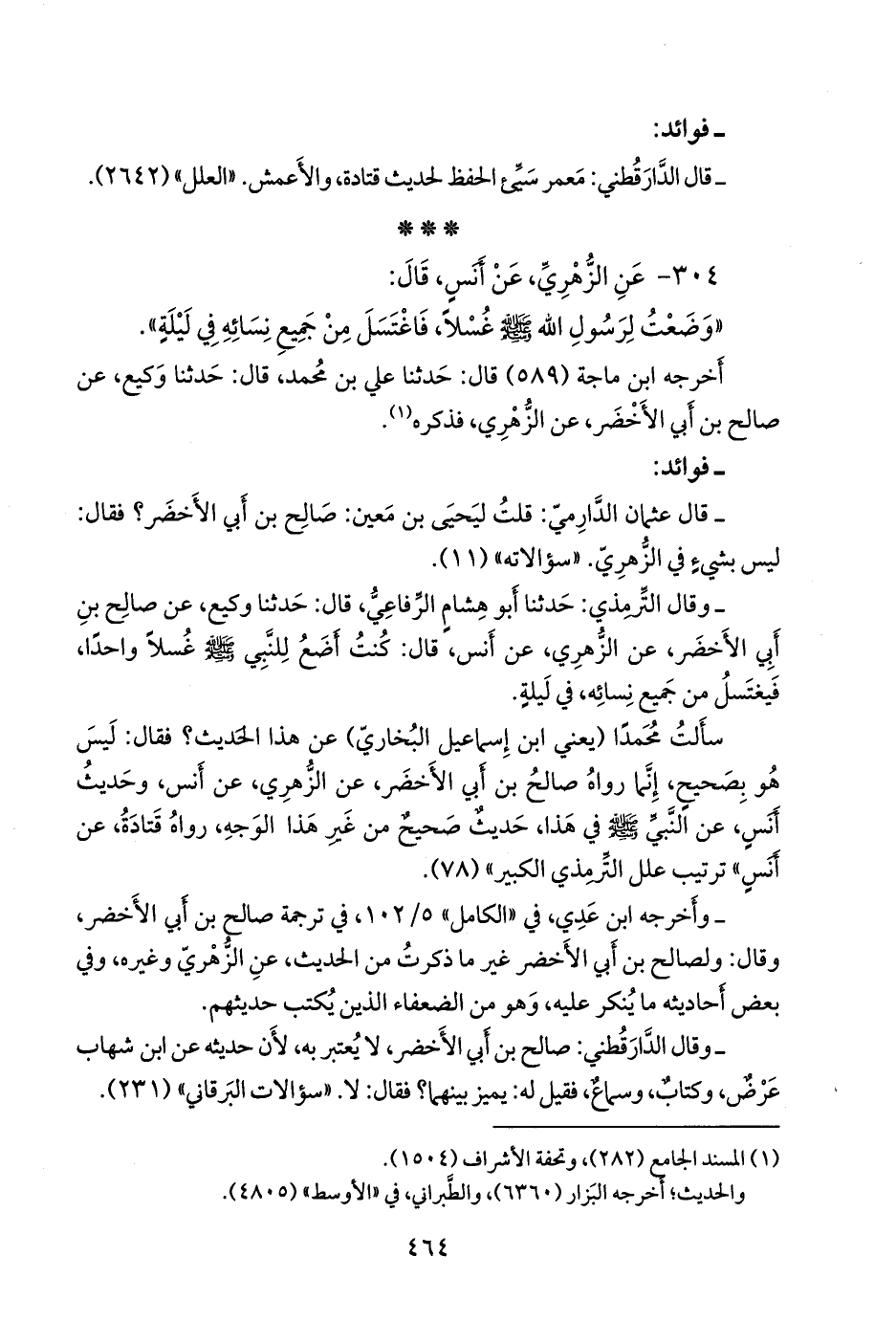 - وقال التِّرمِذي: حدثنا أَبو هشام الرفاعي، قال: حدثنا وكيع، عن صالح بن أبي الأخضر، عن الزُّهْري، عن أَنس، قال: كنت أضع للنبي صَلى الله عَليه وسَلم غسلا واحدا، فيغتسل من جميع نسائه، في ليلة.