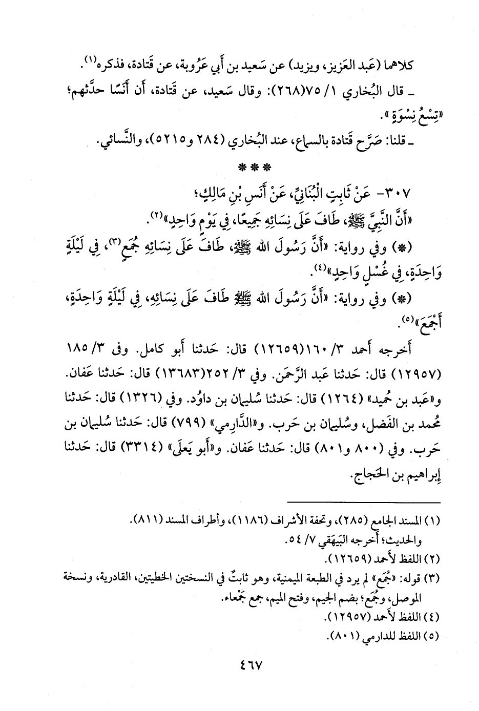 - وفي رواية: «أن رسول الله صَلى الله عَليه وسَلم طاف على نسائه، في ليلة واحدة، أجمع» (¬٤).