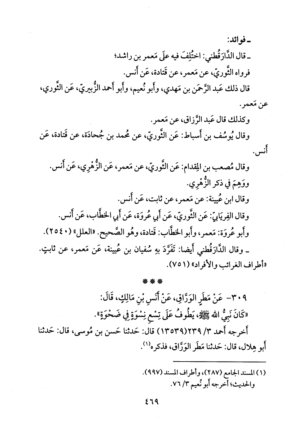 - وقال الدارقُطني أَيضا: تَفرَّد به سفيان بن عُيينة، عن مَعمر، عن ثابت. «أَطراف الغرائب والأفراد» (٧٥١).