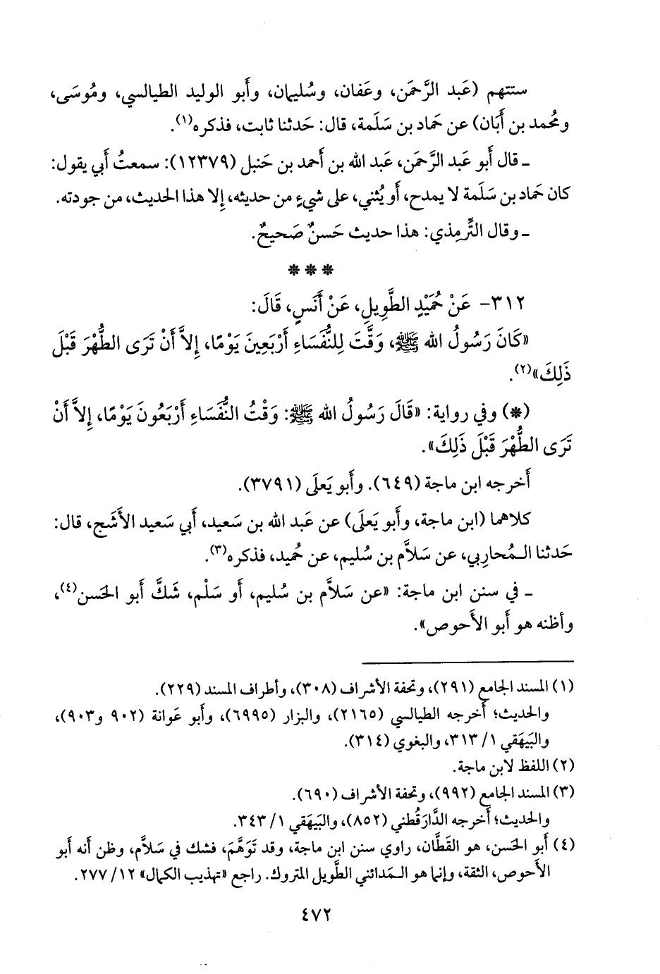 - وفي رواية: «عن أَنس، قال: قال رسول الله صَلى الله عَليه وسَلم: وقت النفساء أربعون يوما، إلا أن ترى الطهر قبل ذلك».