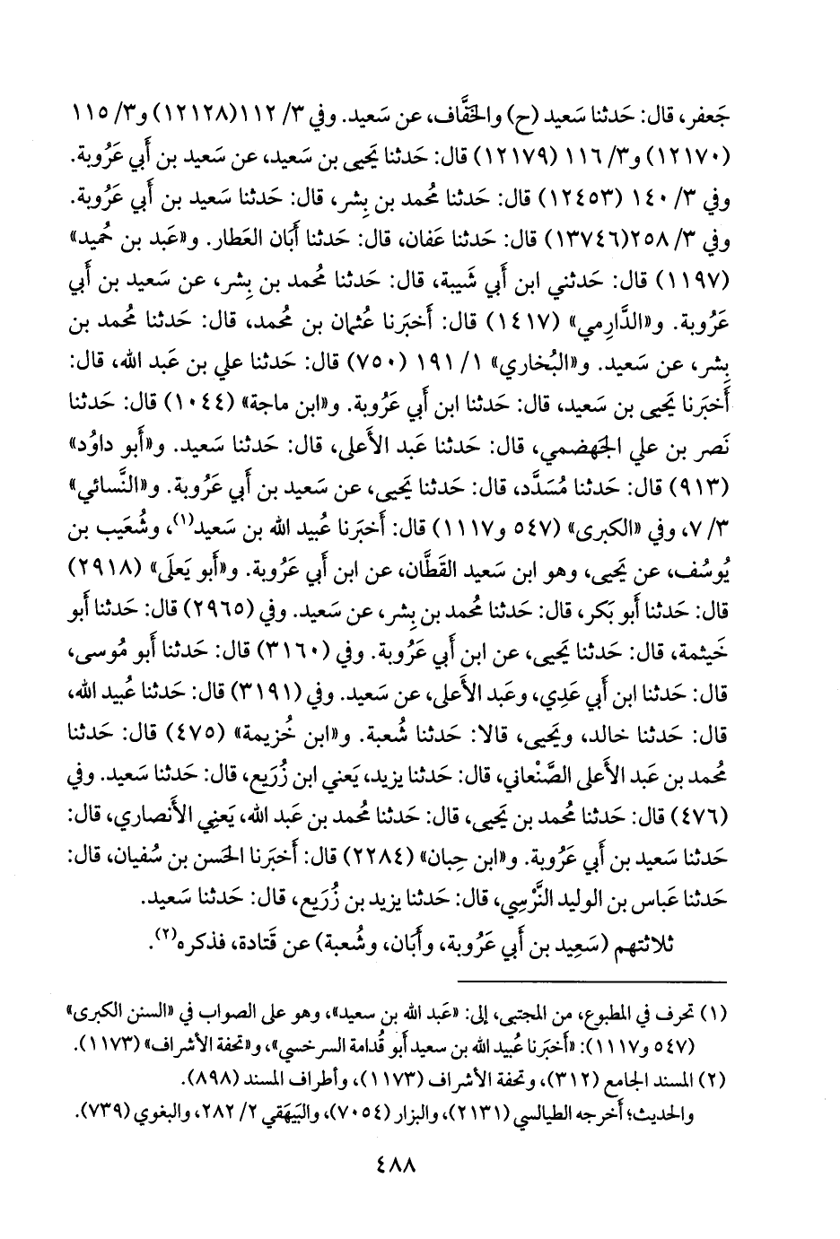 و «أَبو داود» (٩١٣) قال: حدثنا مُسدد، قال: حدثنا يحيى، عن سعيد بن أبي عَروبَة. و «النَّسَائي» ٣/ ٧، وفي «الكبرى» (٥٤٧ و ١١١٧) قال: أخبرنا عُبيد الله بن سعيد (¬١)، وشعيب بن يوسف، عن يحيى، وهو ابن سعيد القطان، عن ابن أبي عَروبَة. و «أَبو يَعلى» (٢٩١٨) قال: حدثنا أَبو بكر، قال: حدثنا محمد بن بشر، عن سعيد. وفي (٢٩٦٥) قال: حدثنا أَبو خيثمة، قال: حدثنا يحيى، عن ابن أبي عَروبَة. وفي (٣١٦٠) قال: حدثنا أَبو موسى، قال: حدثنا ابن أَبي عَدي، وعبد الأعلى، عن سعيد. وفي (٣١٩١) قال: حدثنا عُبيد الله، قال: حدثنا خالد، ويحيى، قالا: حدثنا شعبة. و «ابن خزيمة» (٤٧٥) قال: حدثنا محمد بن عبد الأعلى الصَّنْعاني، قال: حدثنا يزيد، يعني ابن زُريع، قال: حدثنا سعيد. وفي (٤٧٦) قال: حدثنا محمد بن يحيى، قال: حدثنا محمد بن عبد الله، يعني الأَنصاري، قال: حدثنا سعيد بن أبي عَروبَة. و «ابن حِبَّان» (٢٢٨٤) قال: أخبرنا الحسن بن سفيان، قال: حدثنا عباس بن الوليد النَّرْسي، قال: حدثنا يزيد بن زُريع، قال: حدثنا سعيد.