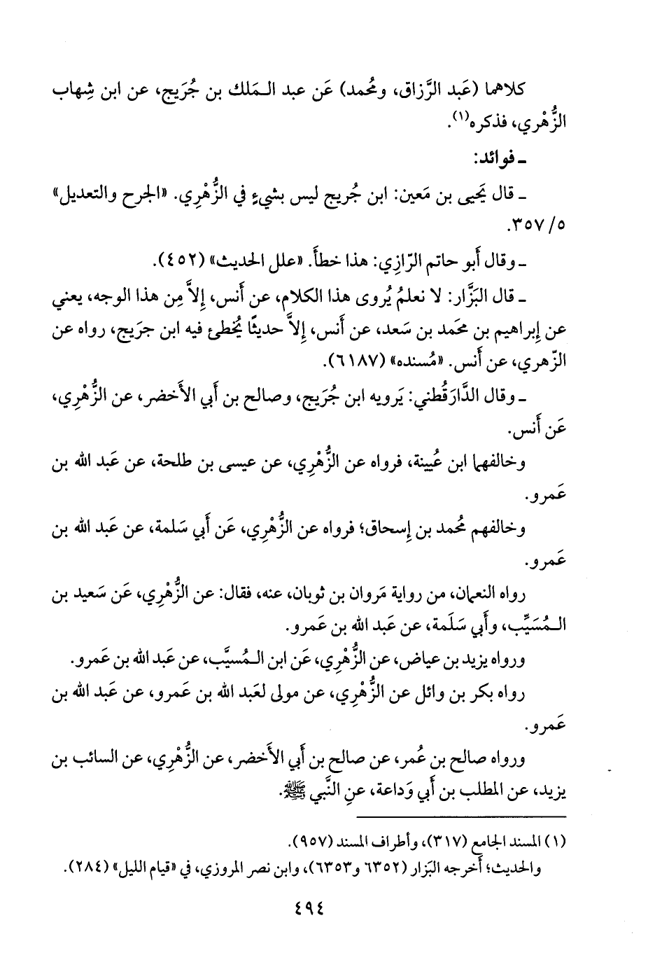 - وقال الدارقُطني: يرويه ابن جُريج، وصالح بن أَبي الأَخضر، عن الزُّهْري، عن أَنس.