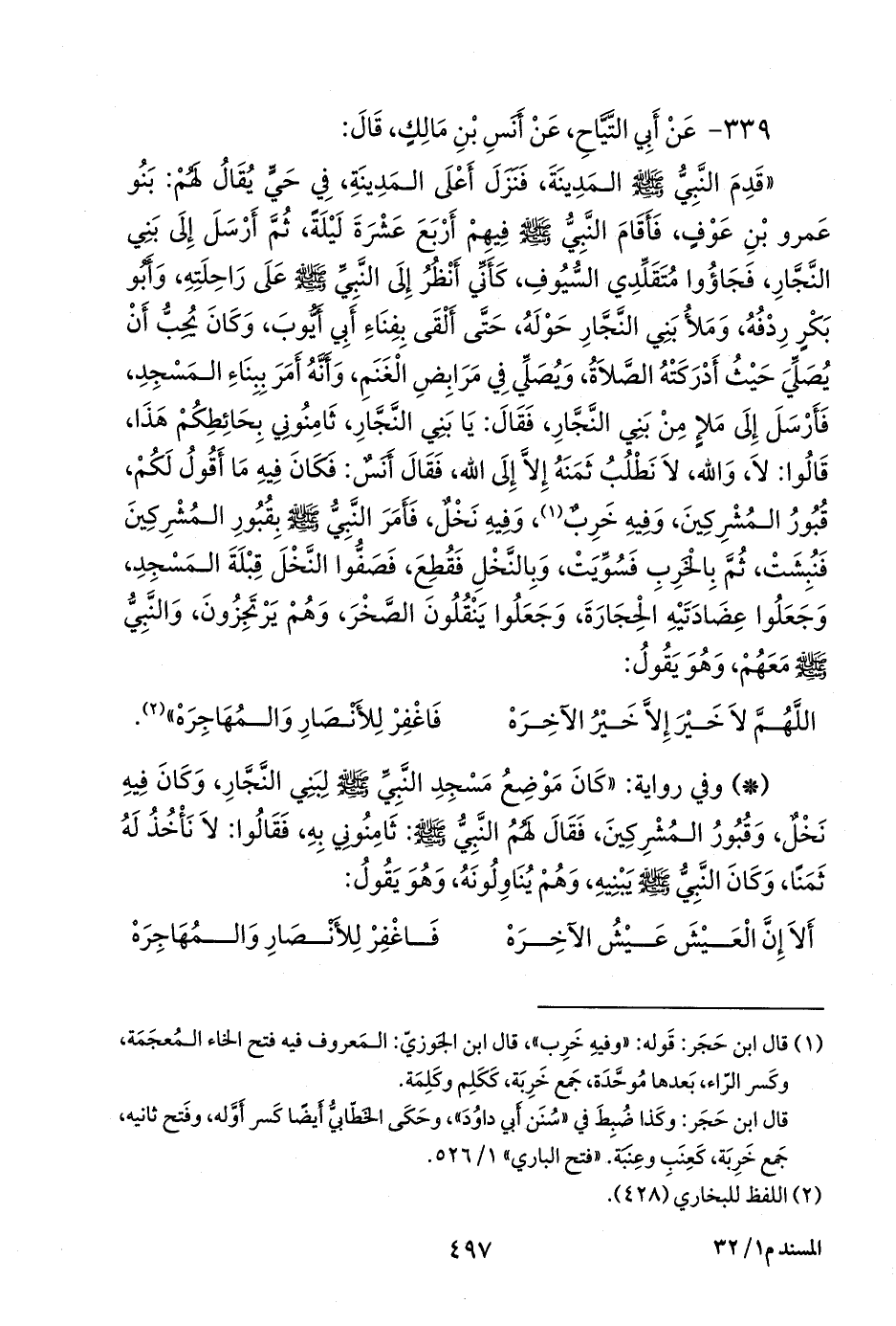 - وفي رواية: «كان موضع مسجد النبي صَلى الله عَليه وسَلم لبني النجار، وكان فيه نخل، وقبور المشركين، فقال لهم النبي صَلى الله عَليه وسَلم: ثامنوني به، فقالوا: لا نأخذ له ثمنا، وكان النبي صَلى الله عَليه وسَلم يبنيه، وهم يناولونه، وهو يقول: