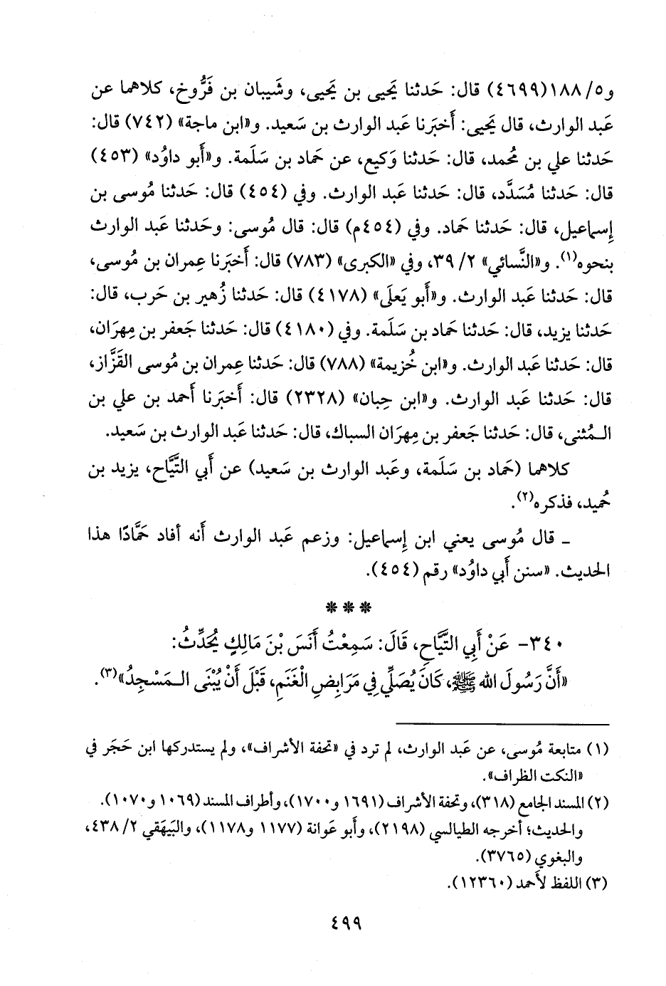 (¬٣) في الطبعة التركية، وجميع الطبعات التي طُبعت عنها: «يَحيى بن يَحيى»، وعلى الحاشية: «يَحيى بن حبيب»، وإِشارة إِلى نسخة، قلنا: والصواب: «يَحيى بن حبيب»، كما جاء في «تحفة الأشراف» (١٦٩٣)، منسوبا: «يَحيى بن حبيب بن عربي»، ويؤيده أنه لا توجد رواية في الكتب الستة، وليس في مسلم فقط، ليحيى بن يَحيى، عن خالد بن الحارث، بل لم يذكره المِزِّي في الرواة عنه، وذكر يَحيى بن حبيب بن عربي، ورمز له برمز مسلم، وأبي داود، والتِّرمِذي، والنَّسَائي. «تهذيب الكمال» ٨/ ٣٦.