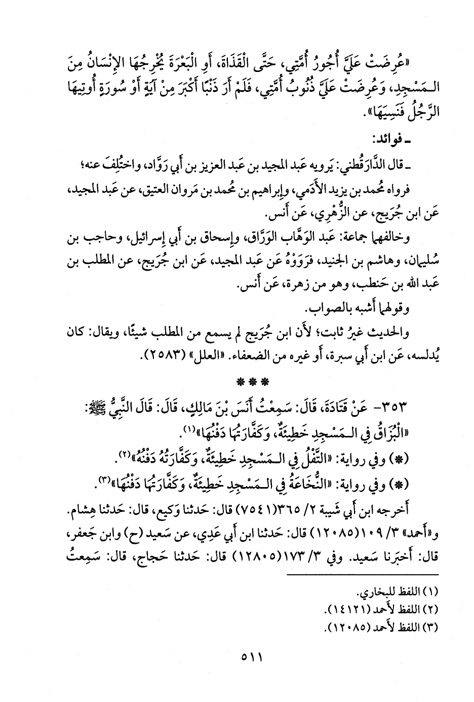 - وفي رواية: «النخاعة في المسجد خطيئة، وكفارتها دفنها» (¬٣).