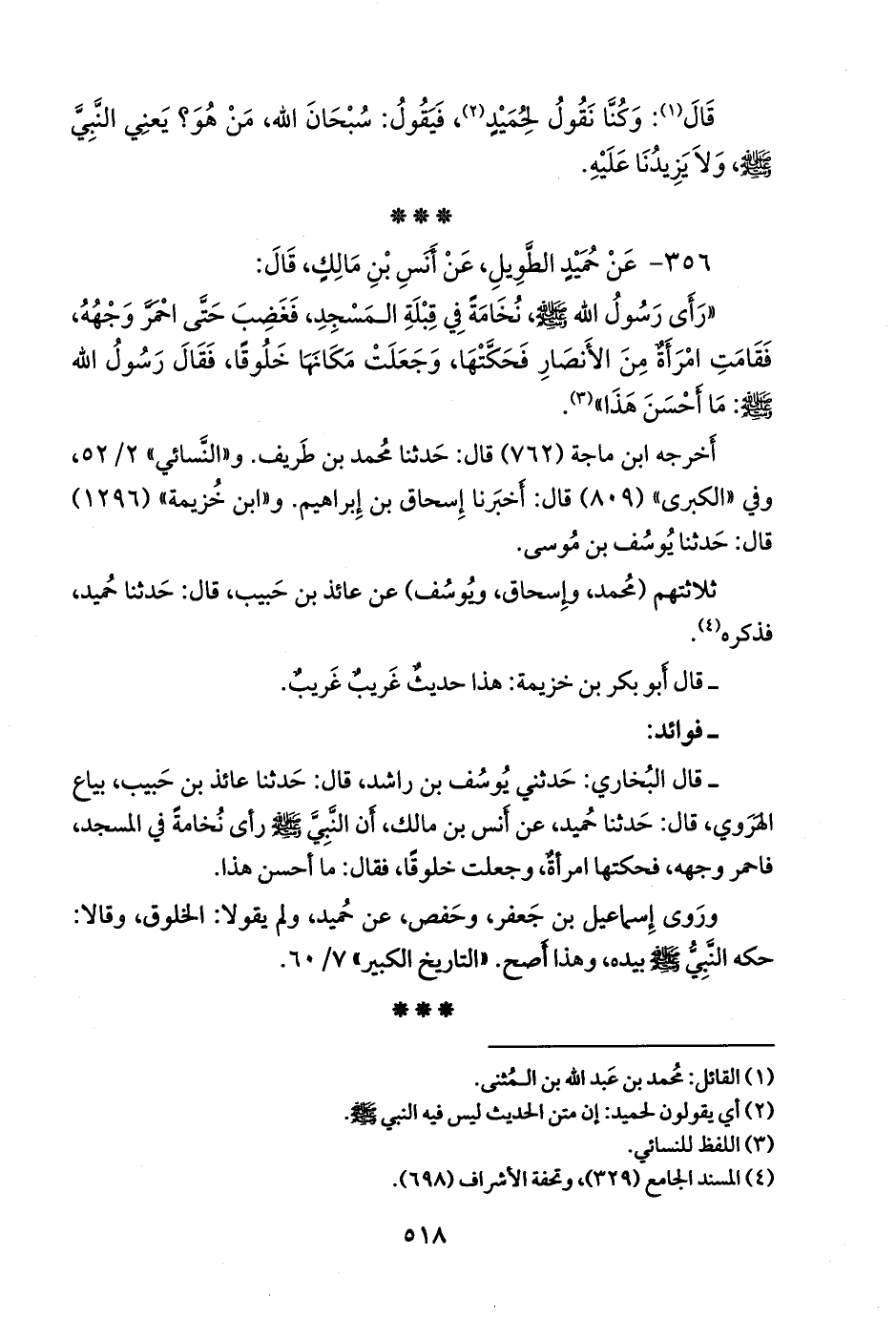 - قال البخاري: حدثني يوسف بن راشد، قال: حدثنا عائذ بن حبيب، بياع الهَرَوي، قال: حدثنا حُميد، عن أَنس بن مالك، أَن النبي صَلى الله عَليه وسَلم رأى نُخامة في المسجد، فاحمر وجهه، فحكتها امرأَة، وجعلت خَلوقًا، فقال: ما أَحسن هذا.