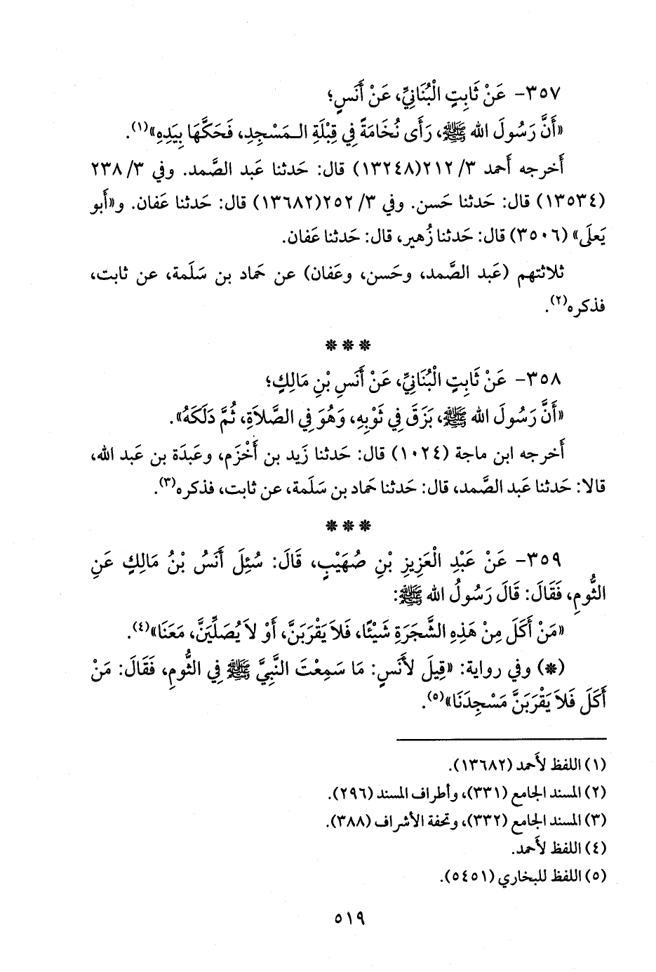 ٣٥٩ - عن عبد العزيز بن صُهَيب، قال: سئل أَنس بن مالك عن الثوم، فقال: قال رسول الله صَلى الله عَليه وسَلم:
