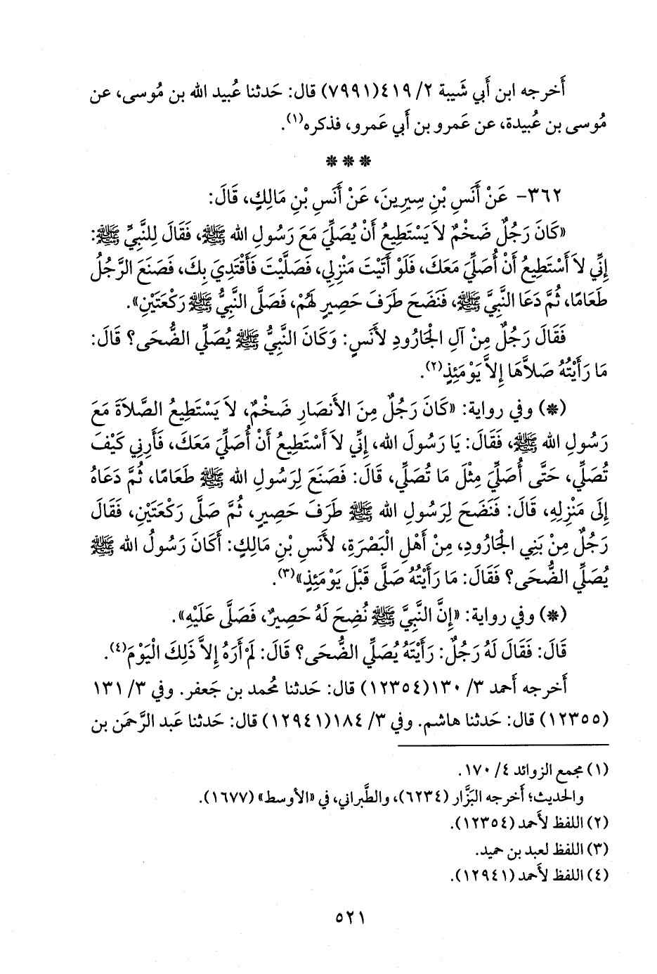 - وفي رواية: «كان رجل من الأنصار ضخم، لا يستطيع الصلاة مع رسول الله صَلى الله عَليه وسَلم فقال: يا رسول الله، إني لا أستطيع أن أصلي معك، فأرني كيف تصلي، حتى أصلي مثل ما تصلي، قال: فصنع لرسول الله صَلى الله عَليه وسَلم طعاما، ثم دعاه إلى منزله، قال: فنضح لرسول الله صَلى الله عَليه وسَلم طرف حصير، ثم صلى ركعتين، فقال رجل من بني الجارود، من أهل البصرة، لأنس بن مالك: أكان رسول الله صَلى الله عَليه وسَلم يصلي الضحى؟ فقال: ما رأيته صلى قبل يومئذ» (¬٢).