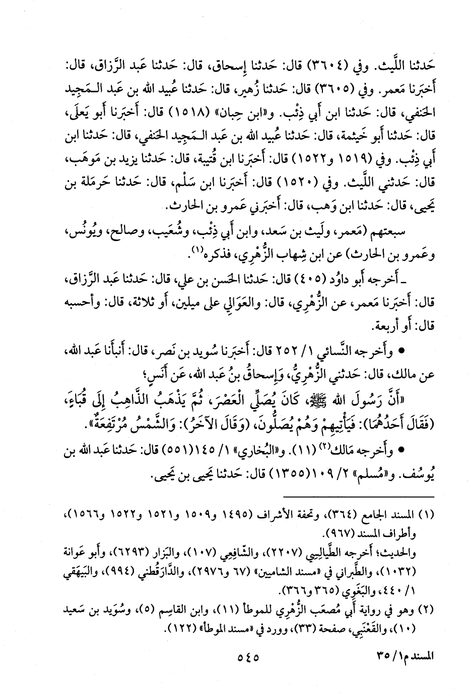 وفي (٣٦٠٤) قال: حدثنا إسحاق، قال: حدثنا عبد الرزاق، قال: أخبرنا مَعمَر. وفي (٣٦٠٥) قال: حدثنا زهير، قال: حدثنا عُبيد الله بن عبد المجيد الحنفي، قال: حدثنا ابن أبي ذِئب. و «ابن حِبَّان» (١٥١٨) قال: أخبرنا أَبو يَعلى، قال: حدثنا أَبو خيثمة، قال: حدثنا عُبيد الله بن عبد المجيد الحنفي، قال: حدثنا ابن أبي ذِئب. وفي (١٥١٩ و ١٥٢٢) قال: أخبرنا ابن قتيبة، قال: حدثنا يزيد بن مَوهَب، قال: حدثني الليث. وفي (١٥٢٠) قال: أخبرنا ابن سلم، قال: حدثنا حَرملة بن يحيى، قال: حدثنا ابن وهب، قال: أخبرني عَمرو بن الحارث.