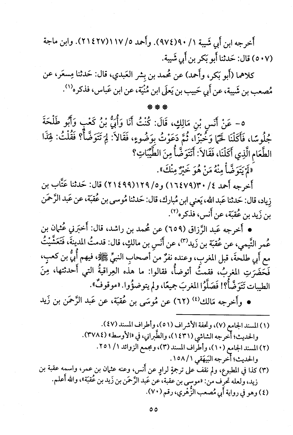 ٥ - عن أَنس بن مالك, قال: كنت أنا وأُبي بن كعب وأَبو طلحة جلوسا, فأكلنا لحما وخبزا, ثم دعوت بوضوء, فقالا: لم تتوضأ؟ فقلت: لهذا الطعام الذي أكلنا، فقالا: أتتوضأ من الطيبات؟