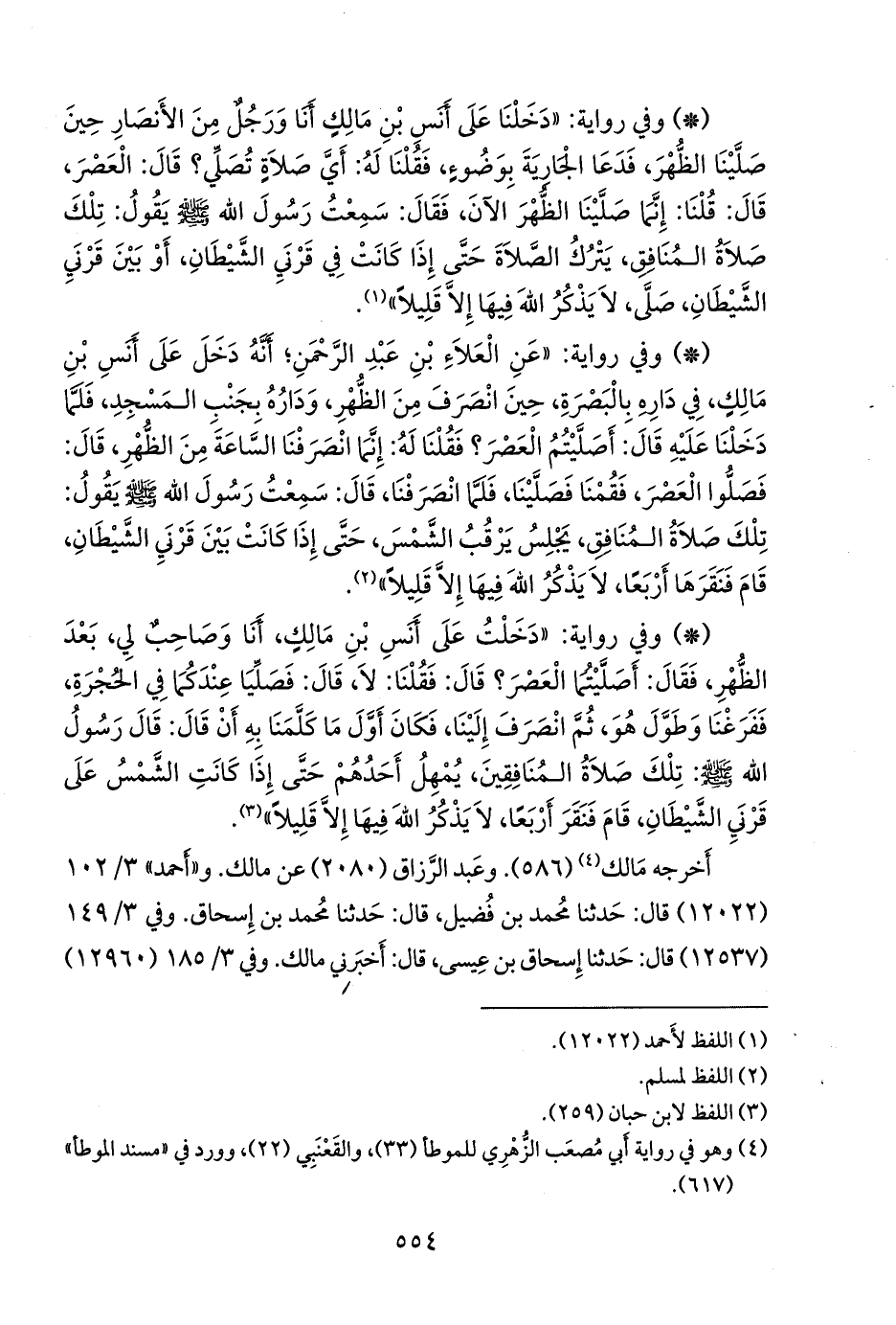 - وفي رواية: «عن العلاء بن عبد الرَّحمَن؛ أنه دخل على أَنس بن مالك، في داره بالبصرة، حين انصرف من الظهر، وداره بجنب المسجد، فلما دخلنا عليه قال: أصليتم العصر؟ فقلنا له: إنما انصرفنا الساعة من الظهر، قال: فصلوا العصر، فقمنا فصلينا، فلما انصرفنا، قال: سمعت رسول الله صَلى الله عَليه وسَلم يقول: تلك صلاة المنافق، يجلس يرقب الشمس، حتى إذا كانت بين قرني الشيطان، قام فنقرها أربعا، لا يذكر الله فيها إلا قليلا» (¬١).