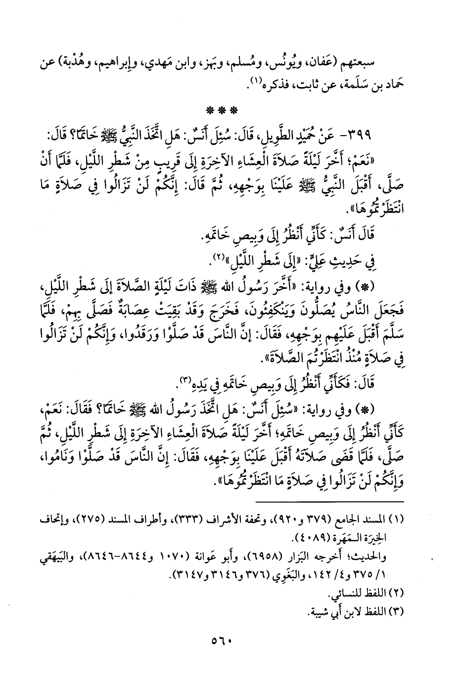 ٣٩٩ - عن حميد الطويل، قال: سئل أنس: هل اتخذ النبي صَلى الله عَليه وسَلم خاتما؟ قال: