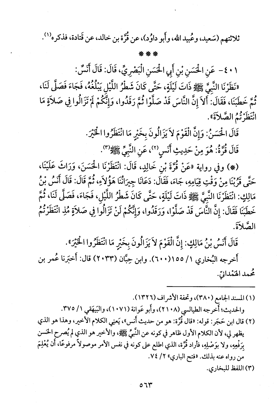 - وفي رواية: «عن قرة بن خالد، قال: انتظرنا الحسن، وراث علينا، حتى قربنا من وقت قيامه، جاء، فقال: دعانا جيراننا هؤلاء، ثم قال: قال أَنس بن مالك: انتظرنا النبي صَلى الله عَليه وسَلم ذات ليلة، حتى كان شطر الليل، فجاء، فصلى لنا، ثم خطبنا فقال: إن الناس قد صلوا، ورقدوا، وإنكم لن تزالوا في صلاة مذ انتظرتم الصلاة.