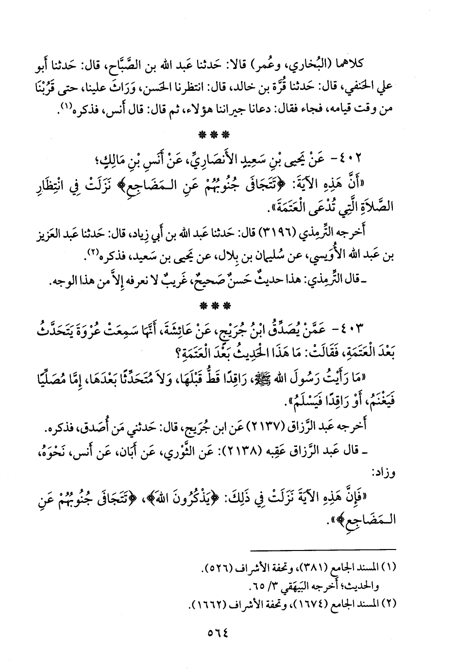 «أن هذه الآية: {تتجافى جنوبهم عن المضاجع} نزلت في انتظار الصلاة التي تدعى العتمة».