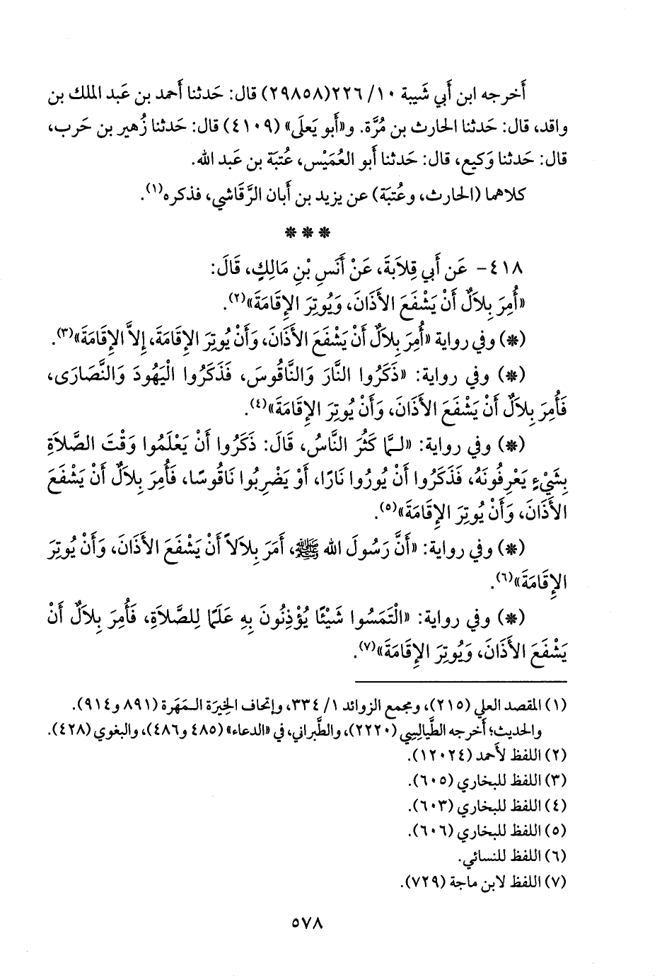 - وفي رواية: «أمر بلال أن يشفع الأذان، وأن يوتر الإقامة، إلا الإقامة» (¬٢).