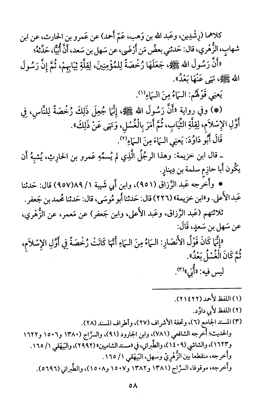 - وفي رواية: «أن رسول الله صَلى الله عَليه وسَلم إنما جعل ذلك رخصة للناس، في أول الإسلام، لقلة الثياب، ثم أمر بالغسل، ونهى عن ذلك».