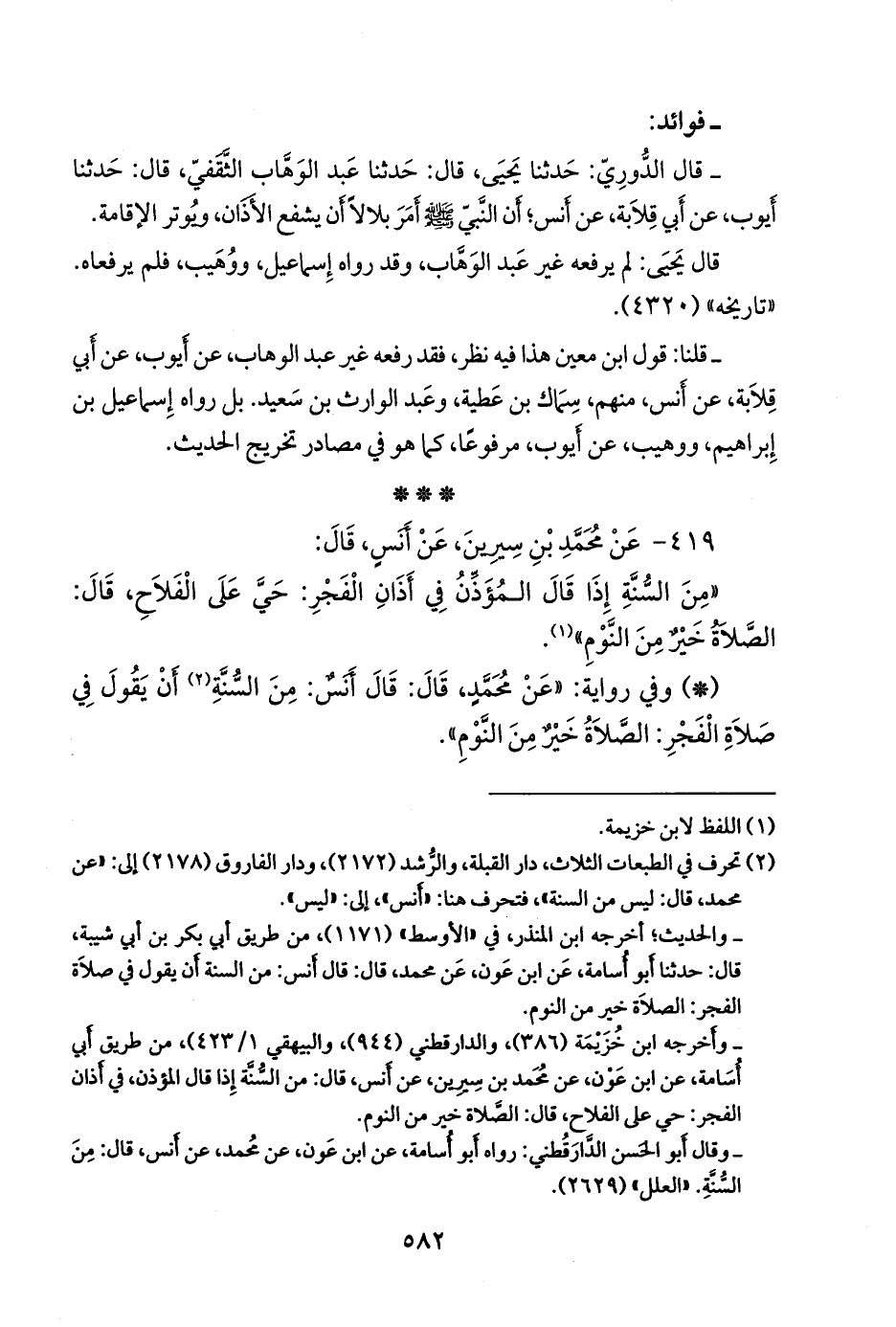 (¬٢) تصحف في الطبعات الثلاث، دار القبلة، والرشد (٢١٧٢)، ودار الفاروق (٢١٧٨) إلى: «عن محمد، قال: ليس من السنة»، فتصحف هنا: «أنس»، إلى: «ليس»، والحديث؛ أخرجه ابن المنذر في «الأوسط» (١١٧١)، من طريق أَبي بكر بن أبي شيبة، قال: حدثنا أَبو أُسامة، عن ابن عون، عن محمد، قال: قال أنس: من السنة أن يقول في صلاة الفجر: الصلاة خير من النوم، وأخرجه ابن خزيمة (٣٨٦)، والدارقُطني (٩٤٤)، والبيهقي ١/ ٤٢٣)، من طريق أبي أُسامة، عن ابن عون، عن محمد بن سِيرين، عن أَنس، قال: من السنة إذا قال المؤذن، في أذان الفجر: حي على الفلاح، قال: الصلاة خير من النوم، وقال أَبو الحسن الدارقُطني: رواه أَبو أُسامة، عن ابن عون، عن محمد، عن أَنس، قال: من السنة. «العلل» (٢٦٢٩).