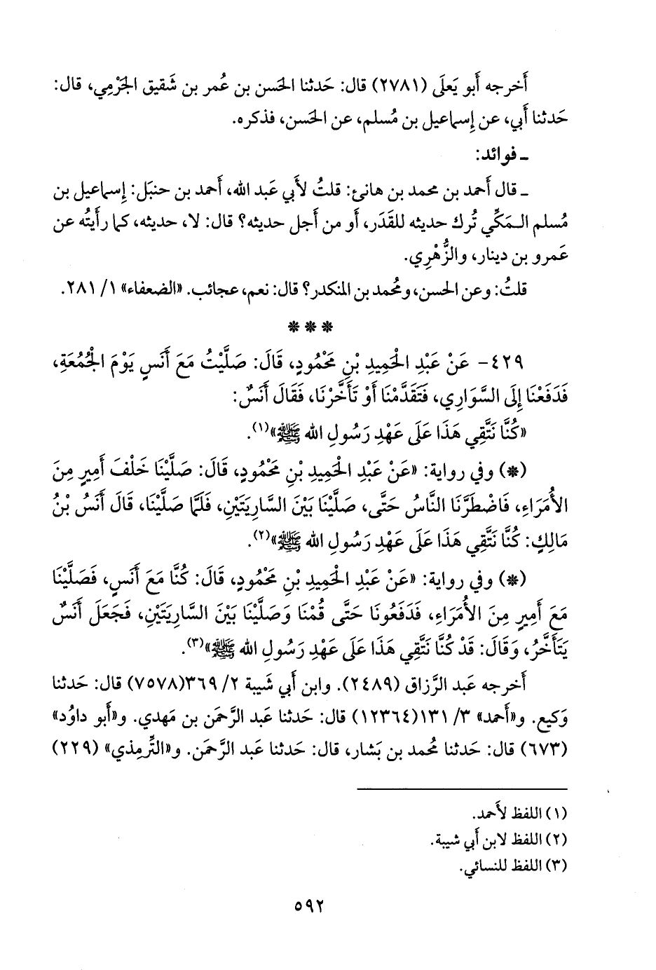 ٤٢٩ - عن عبد الحميد بن محمود، قال: صليت مع أَنس يوم الجمعة، فدفعنا إلى السواري، فتقدمنا أو تأخرنا، فقال أنس:
