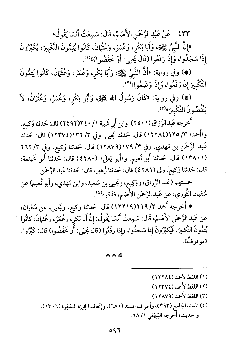 - أخرجه أحمد (١٢٢١٩) قال: حدثنا وكيع، ويحيى، عن سفيان، عن عبد الرَّحمَن الأصم، قال: سمعت أَنسًا يقول: إن أبا بكر، وعمر، وعثمان، كانوا يتمون التكبير، فيكبرون إذا سجدوا، وإذا رفعوا (قال يحيى: أو خفضوا) قال: كبروا. «موقوف».
