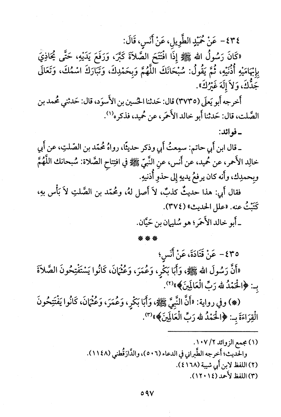 - وفي رواية: «أن النبي صَلى الله عَليه وسَلم وأبا بكر، وعمر، وعثمان، كانوا يستفتحون قراءتهم، في صلاتهم بـ: {الحمد لله رب العالمين}» (¬٤).