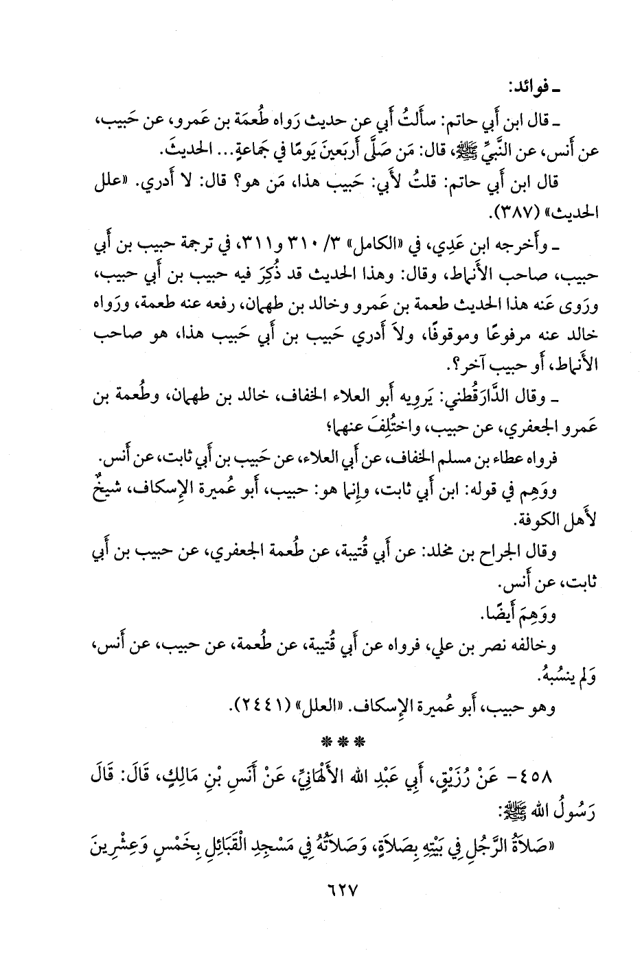 - قلنا: إِسناده ضعيفٌ؛ قال ابن أَبي حاتم: سأَلتُ أَبي عن حديث رواه طُعمَة بن عَمرو، عن حبيب، عن أَنس، عن النبي صَلى الله عَليه وسَلم قال: من صلى أَربعين يومًا في جماعة، الحديثَ.