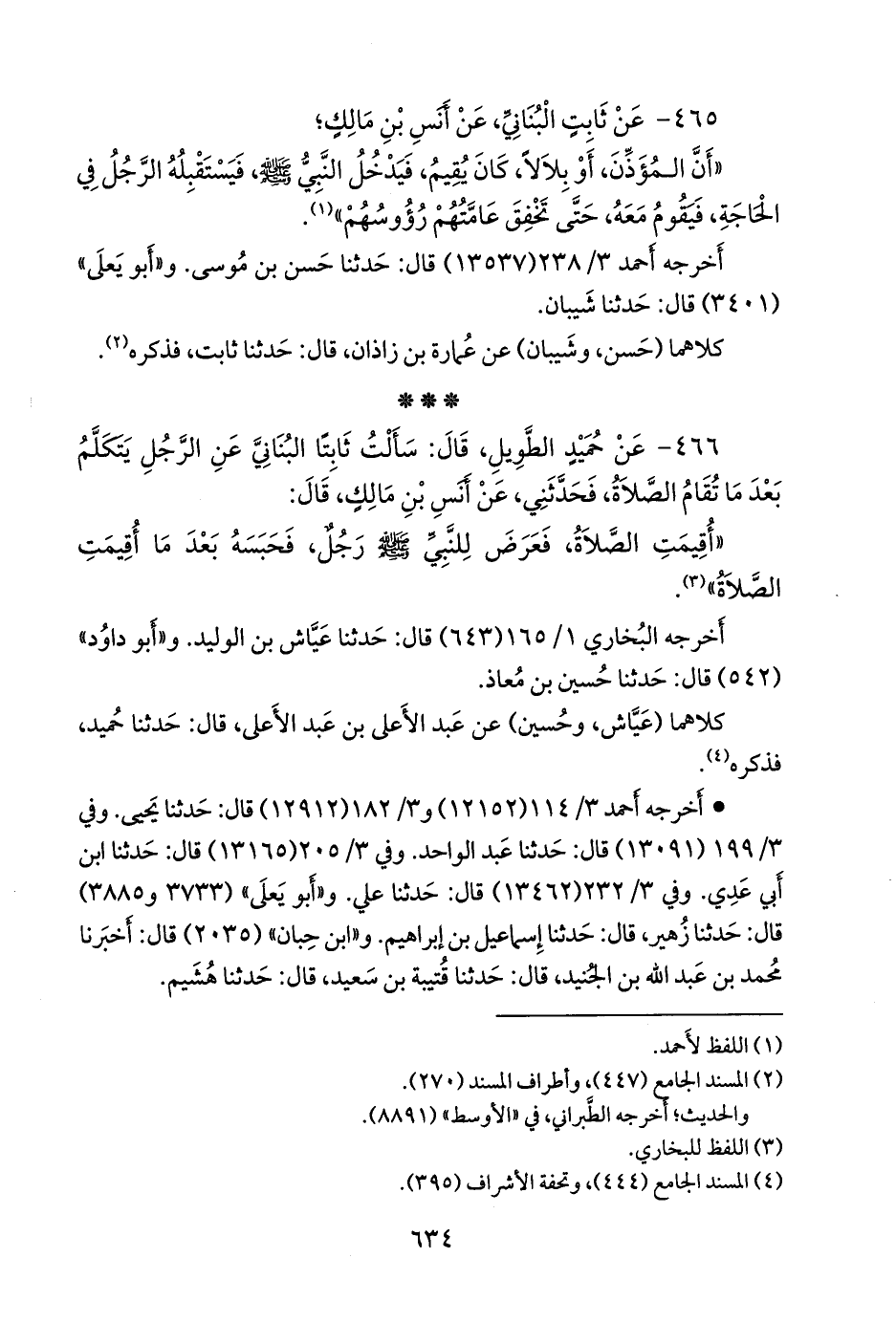 ٤٦٦ - عن حميد الطويل، قال: سألت ثابتا البُنَاني عن الرجل يتكلم بعد ما تقام الصلاة، فحدثني، عن أَنس بن مالك، قال: