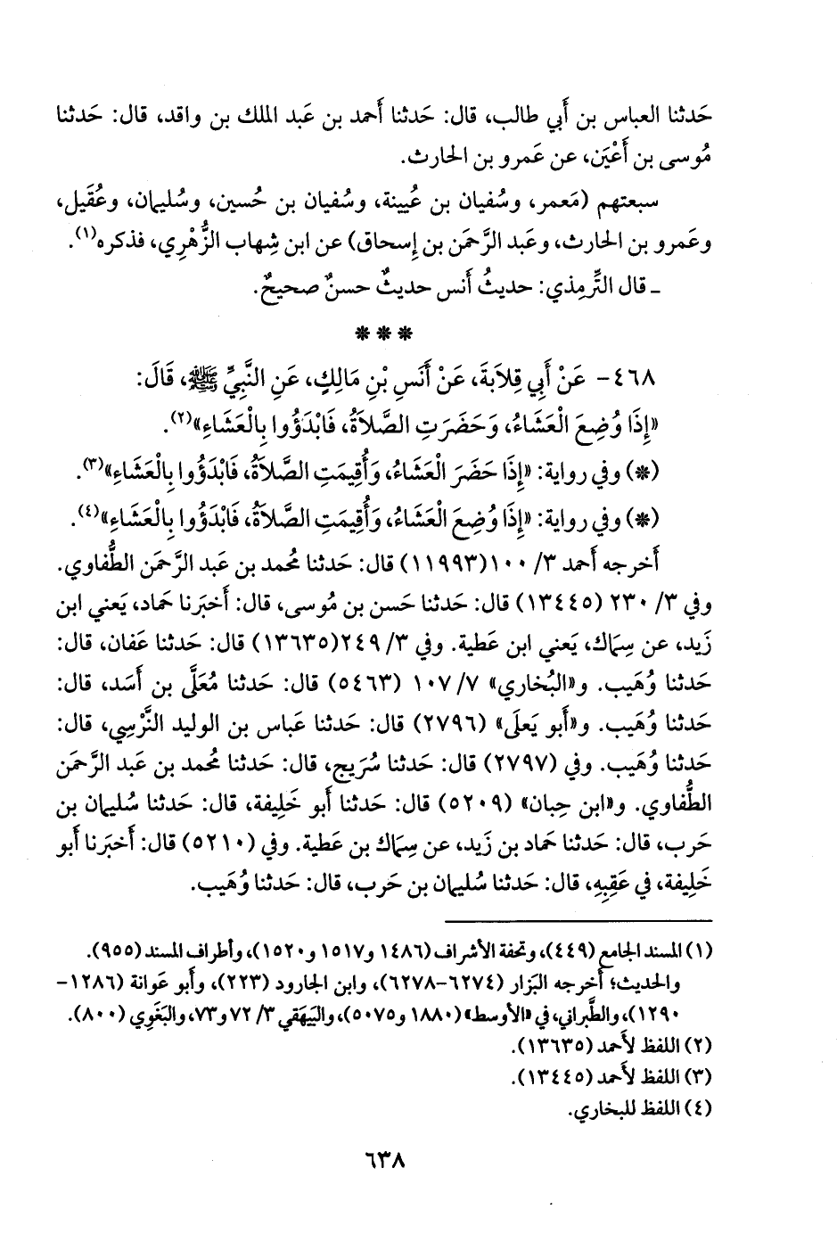 - قال الطبراني: لم يقل في هذا الحديث: «وأَحدكم صائم فليبدأ بالعشاء قبل صلاة المغرب»، إِلا عَمرو بن الحارث، تفرد به موسى بن أَعين. «المعجم الأوسط» (٥٠٧٥).