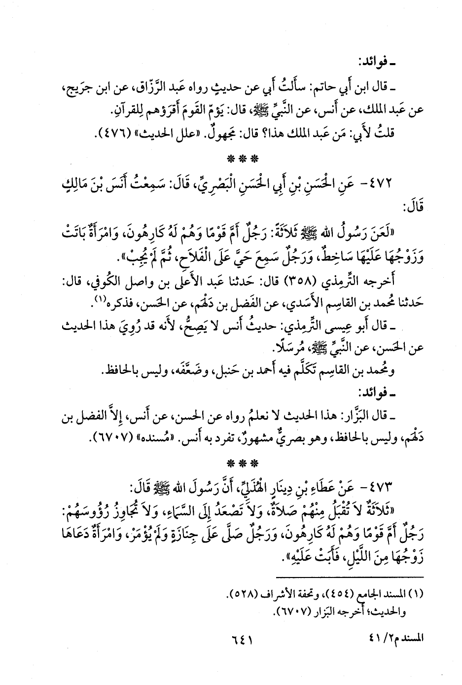 - قال التِّرمِذي: حديث أَنس لا يصح، لأنه قد روي هذا الحديث عن الحسن، عن النبي صَلى الله عَليه وسَلم مُرسلًا.