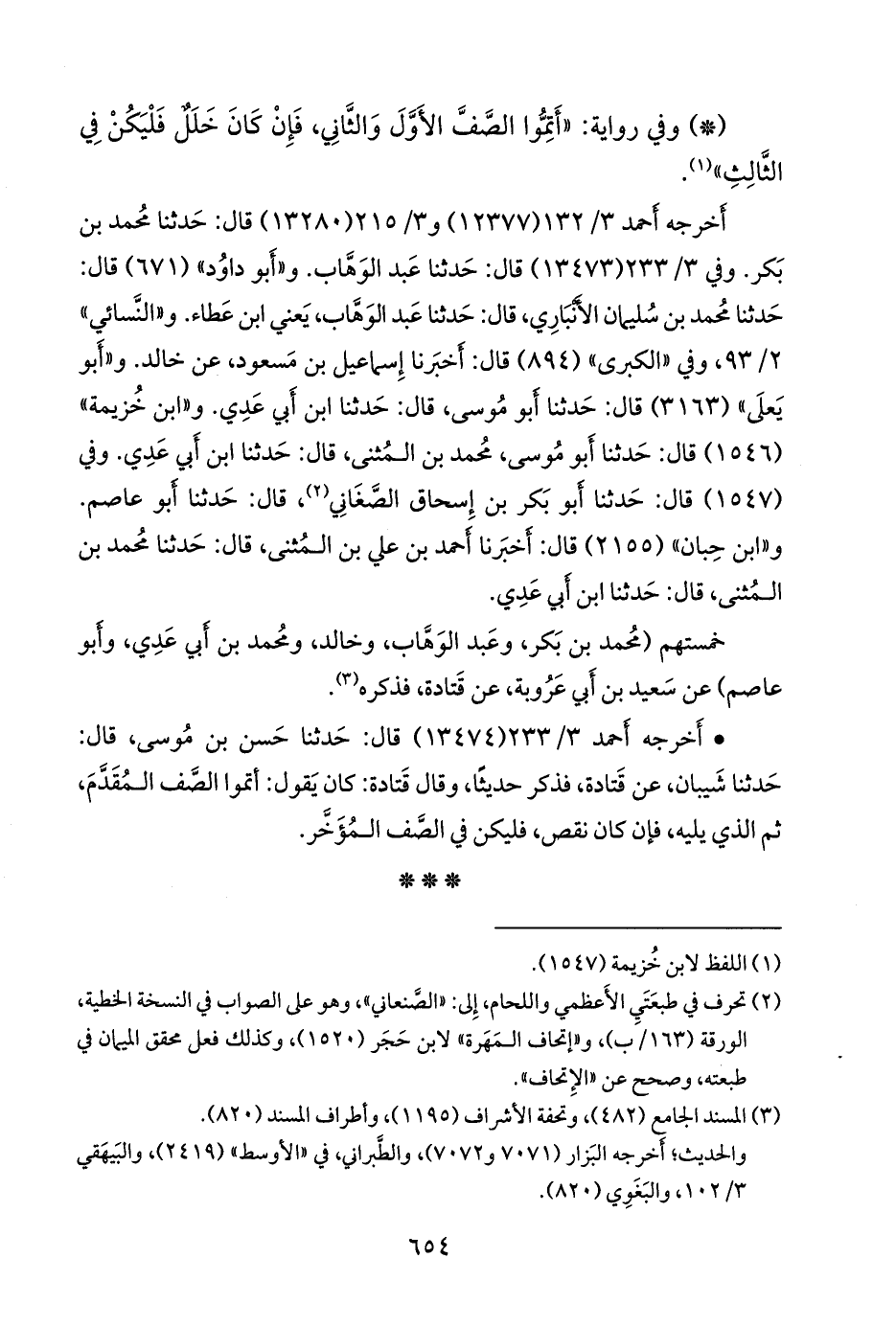 - أخرجه أحمد (١٣٤٧٤) قال: حدثنا حسن بن موسى، قال: حدثنا شَيبان، عن قتادة، فذكر حديثا، وقال قتادة: كان يقول: أتموا الصف المقدم، ثم الذي يليه، فإن كان نقص، فليكن في الصف المؤخر.
