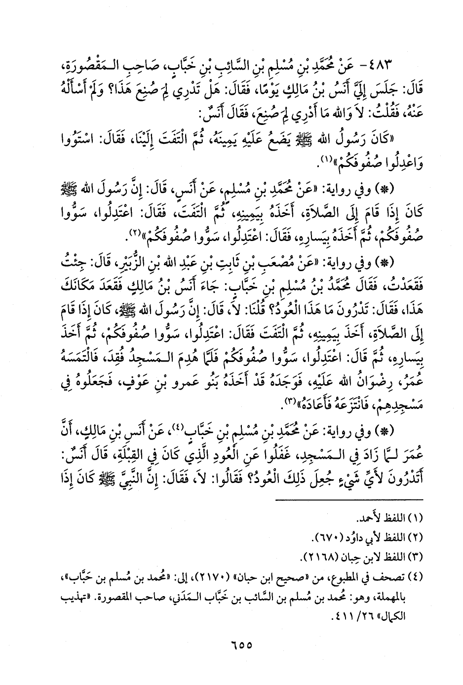 - وفي رواية: «عن محمد بن مسلم، عن أَنس، قال: إن رسول الله صَلى الله عَليه وسَلم كان إذا قام إلى الصلاة، أخذه بيمينه، ثم التفت، فقال: اعتدلوا، سووا صفوفكم، ثم أخذه بيساره، فقال: اعتدلوا، سووا صفوفكم» (¬٢).