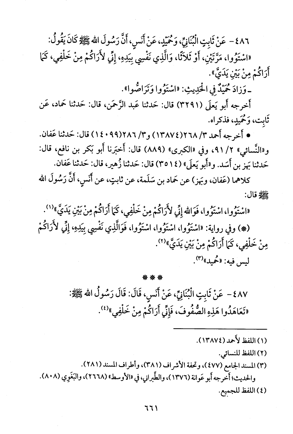 - وفي رواية: «استووا، استووا، استووا، فوالذي نفسي بيده، إني لأراكم من خلفي، كما أراكم من بين يدي» (¬٢).