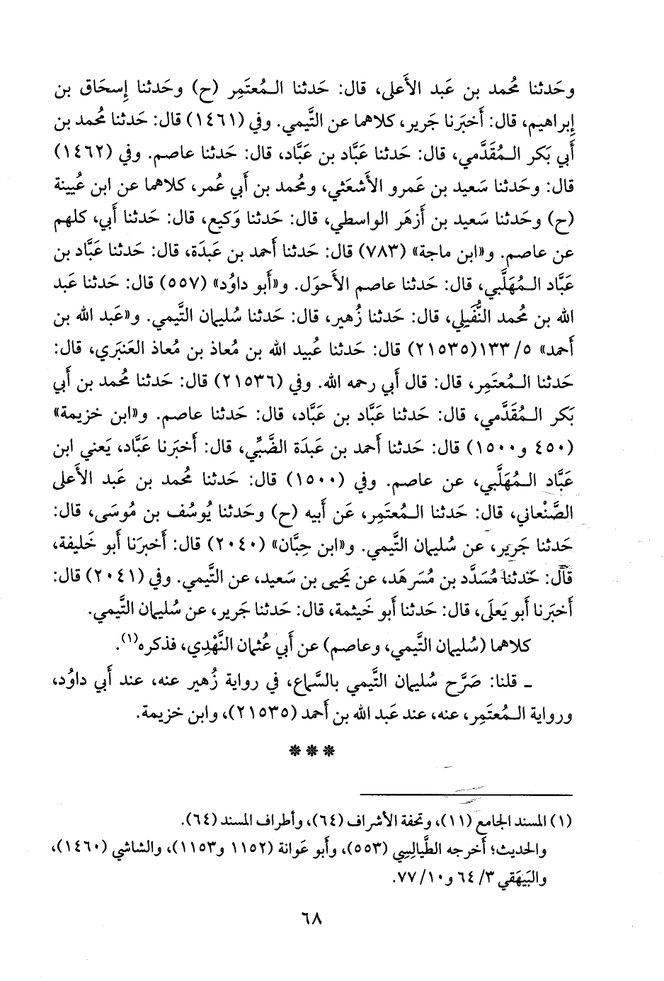 وفي (١٤٦١) قال: حدثنا محمد بن أَبي بكر المُقَدَّمي، قال: حدثنا عباد بن عباد، قال: حدثنا عاصم. وفي (١٤٦٢) قال: وحدثنا سعيد بن عَمرو الأشعثي، ومحمد بن أبي عمر، كلاهما عن ابن عُيينة (ح) وحدثنا سعيد بن أزهر الواسطي، قال: حدثنا وكيع، قال: حدثنا أبي، كلهم عن عاصم. و «ابن ماجة» (٧٨٣) قال: حدثنا أحمد بن عَبدة، قال: حدثنا عباد بن عباد المهلبي، قال: حدثنا عاصم الأحول. و «أَبو داود» (٥٥٧) قال: حدثنا عبد الله بن محمد النفيلي، قال: حدثنا زهير، قال: حدثنا سليمان التيمي. و «عبد الله بن أحمد» ٥/ ١٣٣ (٢١٥٣٥) قال: حدثنا عُبيد الله بن معاذ بن معاذ العنبري، قال: حدثنا المُعتَمِر، قال: قال أبي رحمه الله. وفي (٢١٥٣٦) قال: حدثنا محمد بن أَبي بكر المُقَدَّمي، قال: حدثنا عباد بن عباد، قال: حدثنا عاصم. و «ابن خزيمة» (٤٥٠ و ١٥٠٠) قال: حدثنا أحمد بن عَبدة الضبي، قال: أخبرنا عباد، يعني ابن عباد المهلبي، عن عاصم. وفي (١٥٠٠) قال: حدثنا محمد بن عبد الأعلى الصَّنْعاني، قال: حدثنا المُعتَمِر، عن أبيه (ح) وحدثنا يوسف بن موسى، قال: حدثنا جرير، عن سليمان التيمي. و «ابن حِبَّان» (٢٠٤٠) قال: أخبرنا أَبو خليفة، قال: حدثنا مُسَدد بن مُسَرهد، عن يحيى بن سعيد، عن التيمي. وفي (٢٠٤١) قال: أخبرنا أَبو يَعلى، قال: حدثنا أَبو خيثمة، قال: حدثنا جرير، عن سليمان التيمي.