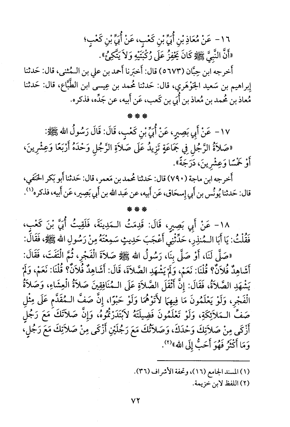«صلى لنا، أو صلى بنا، رسول الله صَلى الله عَليه وسَلم صلاة الفجر، ثم التفت، فقال: أشاهد فلان؟ قلنا: نعم، ولم يشهد الصلاة، قال: أشاهد فلان؟ قلنا: نعم، ولم يشهد الصلاة، فقال: إن أثقل الصلاة على المنافقين صلاة العشاء، وصلاة الفجر، ولو يعلمون ما فيهما لأتوهما ولو حبوا، إن صف المقدم على مثل صف الملائكة، ولو تعلمون فضيلته لابتدرتموه، وإن صلاتك مع رجل أزكى من صلاتك وحدك، وصلاتك مع رجلين أزكى من صلاتك مع رجل، وما أكثر فهو أحب إلى الله» (¬١).