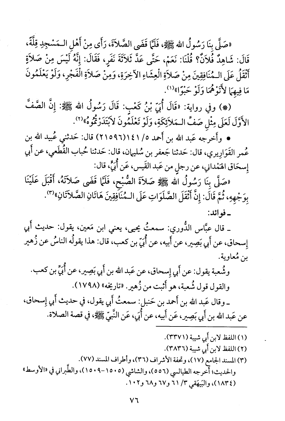 - وقال عبد الله بن أَحمد بن حنبل: سمعتُ أَبي يقول، في حديث أَبي إِسحاق، عن عبد الله بن أَبي بَصير، عن أَبيه، عن أُبَي، عن النبي صَلى الله عَليه وسَلم في قصة الصلاة.