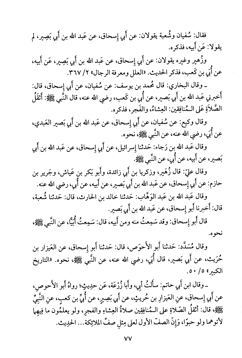 - وقال أَبو محمد عبد الرَّحمَن بن أَبي حاتم: سأَلتُ أَبي وأَبا زُرعة، عن حديث؛ رواه أَبو الأَحوص، عن أَبي إِسحاق، عن العَيزار بن حُريث، عن أَبي بَصير، عن أُبَي بن كعب، عن النبي صَلى الله عَليه وسَلم قال: أَثقل الصلاة على المُنافقين، صلاة العِشاء والفجر، ولو يعلمون ما فيهما لأَتوهما ولو حَبوًا، وإِن الصف الأَول لعلى مِثلِ صفِّ الملائكة، الحديثَ.