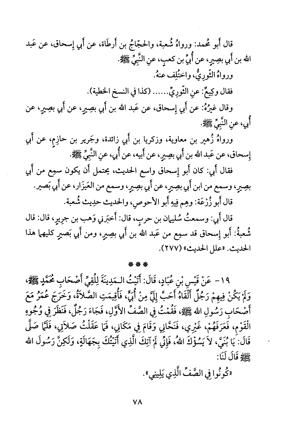 ١٩ - عن قيس بن عُبَاد، قال: أتيت المدينة للقي أصحاب محمد صَلى الله عَليه وسَلم ولم يكن فيهم رجل ألقاه أحب إلي من أبي، فأقيمت الصلاة، وخرج عمر مع أصحاب رسول الله صَلى الله عَليه وسَلم فقمت في الصف الأول، فجاء رجل، فنظر في وجوه القوم، فعرفهم، غيري، فنحاني وقام في مكاني، فما عقلت صلاتي، فلما صلى قال: يا بني، لا يسؤك الله، فإني لم آتك الذي أتيتك بجهالة، ولكن رسول الله صَلى الله عَليه وسَلم قال لنا: