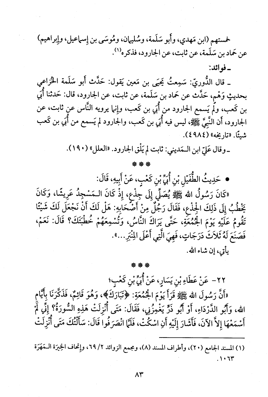- قال عباس بن محمد الدُّوري: سمعتُ يحيى بن مَعين يقول: حَدث أَبو سلمة الخُزاعي بحديث وَهْمٍ، حَدث عن حماد بن سلمة, عن ثابت, عن الجارود، قال: حدثنا أُبَي بن كعب, ولم يَسمع الجارود من أُبَي بن كعب, وإِنما يرويه الناس عن ثابت, عن الجارود, أَن النبي صَلى الله عَليه وسَلم , ليس فيه أُبَي بن كعب, والجارود لم يَسمع من أُبَي بن كعب شيئًا. «تاريخه» (٤٩٨٤).