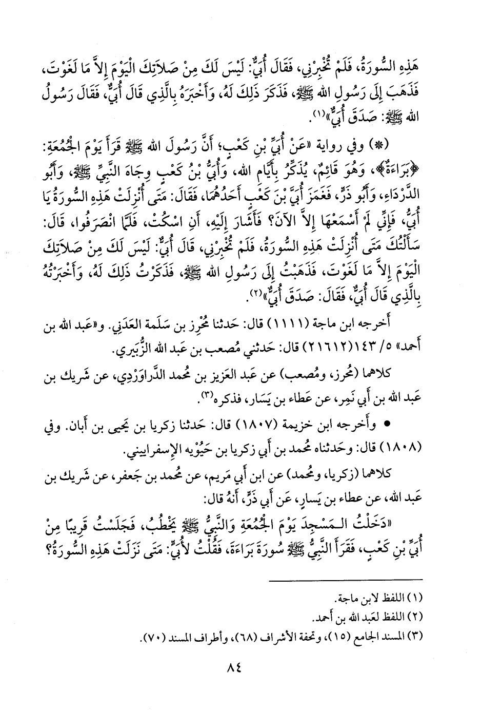 «دخلت المسجد يوم الجمعة والنبي صَلى الله عَليه وسَلم يخطب، فجلست قريبا من أُبي بن كعب، فقرأ النبي صَلى الله عَليه وسَلم سورة براءة، فقلت لأبي: متى نزلت هذه السورة؟
