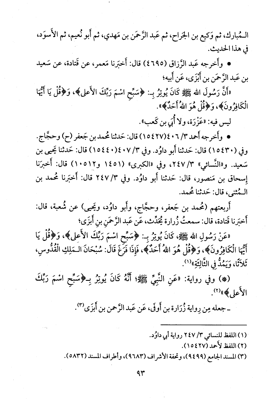 - في رواية عَزرة: عن سعيد بن عبد الرَّحمَن بن أبزى؛ «أن النبي صَلى الله عَليه وسَلم كان يوتر». وساق الحديث.