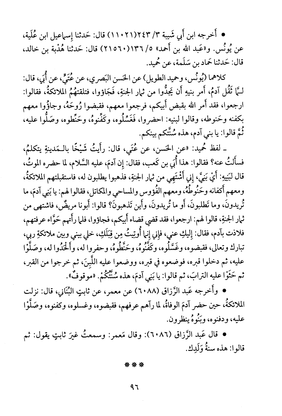 - لفظ حميد: «عن الحسن, عن عتي، قال: رأيت شيخا بالمدينة يتكلم, فسألت عنه؟ فقالوا: هذا أُبي بن كعب، فقال: إن آدم، عليه السلام, لما حضره الموت, قال لبنيه: أي بني, إني أشتهي من ثمار الجنة, فذهبوا يطلبون له, فاستقبلتهم الملائكة, ومعهم أكفانه وحنوطه, ومعهم الفؤوس والمساحي والمكاتل، فقالوا لهم: يا بني آدم, ما تريدون, وما تطلبون، أو ما تريدون, وأين تذهبون؟ قالوا: أَبونا مريض, فاشتهى من ثمار الجنة، قالوا لهم: ارجعوا، فقد قضي قضاء أبيكم, فجاؤوا, فلما رأتهم حواء عرفتهم, فلاذت بآدم، فقال: إليك عني, فإني إنما أوتيت من قبلك, خلي بيني وبين ملائكة ربي, تبارك وتعالى, فقبضوه, وغسلوه, وكفنوه, وحنطوه, وحفروا له, وألحدوا له, وصلوا عليه, ثم دخلوا قبره, فوضعوه في قبره, ووضعوا عليه اللبن, ثم خرجوا من القبر, ثم حثوا عليه التراب, ثم قالوا: يا بني آدم, هذه سنتكم. «موقوف»