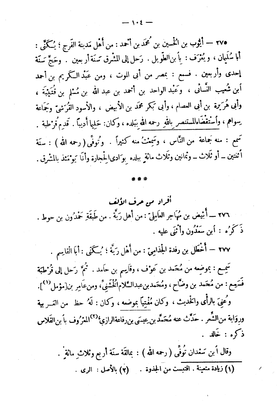 275 - أيُّوب بن الحُسين بن مُحمد بن أحْمد: من أهل مَدينة الفَرج؛ يُكَنَّى: أبا سُليمان، ويُعرف: بِابن الطّويل. رحَل إلى المشْرق سَنَة أربعين. وحجَّ سَنة إحدى وأربعين. فسمع: بمصر من أبي الموت، ومن عَبْدَ الكريم بن أحمد آبن شُعيب النَّسائي، وعَبْد الواحد بن أحمد بن عبد الل بن مُسلم بن قُتيَبة، وأبي هُريرة بن أبي العصام، وأبي بَكر محَمد بن الأبيض، والأسود القُرشيّ وجمَاعة سِواهم، وآستقضاه المستنصرِ بِاللهِ رحمه الله بِبلده، وكان: حَليماً أديباً. قَدِم قُرطُبة. سَمع: منه جَماعة من النَّاس، وسَمِعْتُ منه كثيراً. وتُوفِّي (رحمه الله) : سنة آثنتين - أو ثَلاث - وثمانين وثَلاث مائةٍ ببلده بوادي الحِجارة وأنَا يَومْئذ بالمشرق.