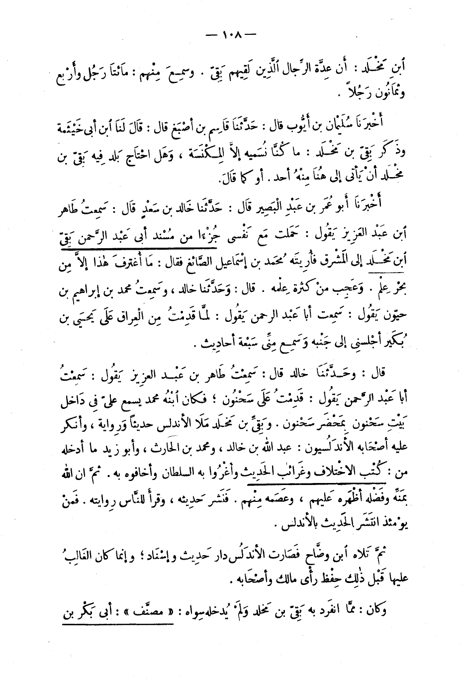 قال: وحدَّثَنَا خالد قال: سمعتُ طَاهر بن عَبْد العزيز يَقول: سمعتُ أبا عبد الرَّحمن يَقُول: قَدِمتُ علَى سَحنُون؛ فكان آبنه محمد يسمع عليّ فِي دَاخل بَيتِ سَحنون بِمَحْضَر سَحنون. وبقيِّ بن مَخلَد مَلاَ الأندلس حديثاً ورِواية، وأنكر عليه أصحابه الأندلسيون: عبد الله بن خالد، ومحمد بن الحارث، وأبو زيد ما أدخله من: كُتْب الاخْتلاف وغَرائب الحَديث وأغْرُوا به السلطان وأخافوه به. ثمَّ ان الله بمَنَّه وفَضله أظهره عَليهم، وعَصَمه مِنهم. فنشر حديثه، وقرأ للنَّاس رِوايته. فمنْ يومئذ انتشر الحَديث بالأندلس.