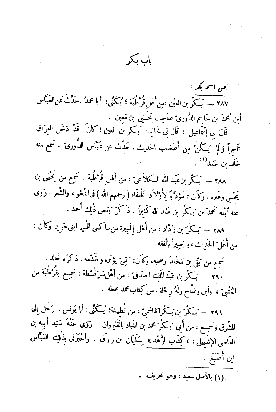 290 - بَكْر بن عَبْد الملِك الصّدفيّ: من أهْل سَرَقُسْطة: سَمِع بقُرطُبَة من العُتْبيّ، وآبن وضَّاح ولَهُ رِحلة. من كِتاب محمد بخطه.